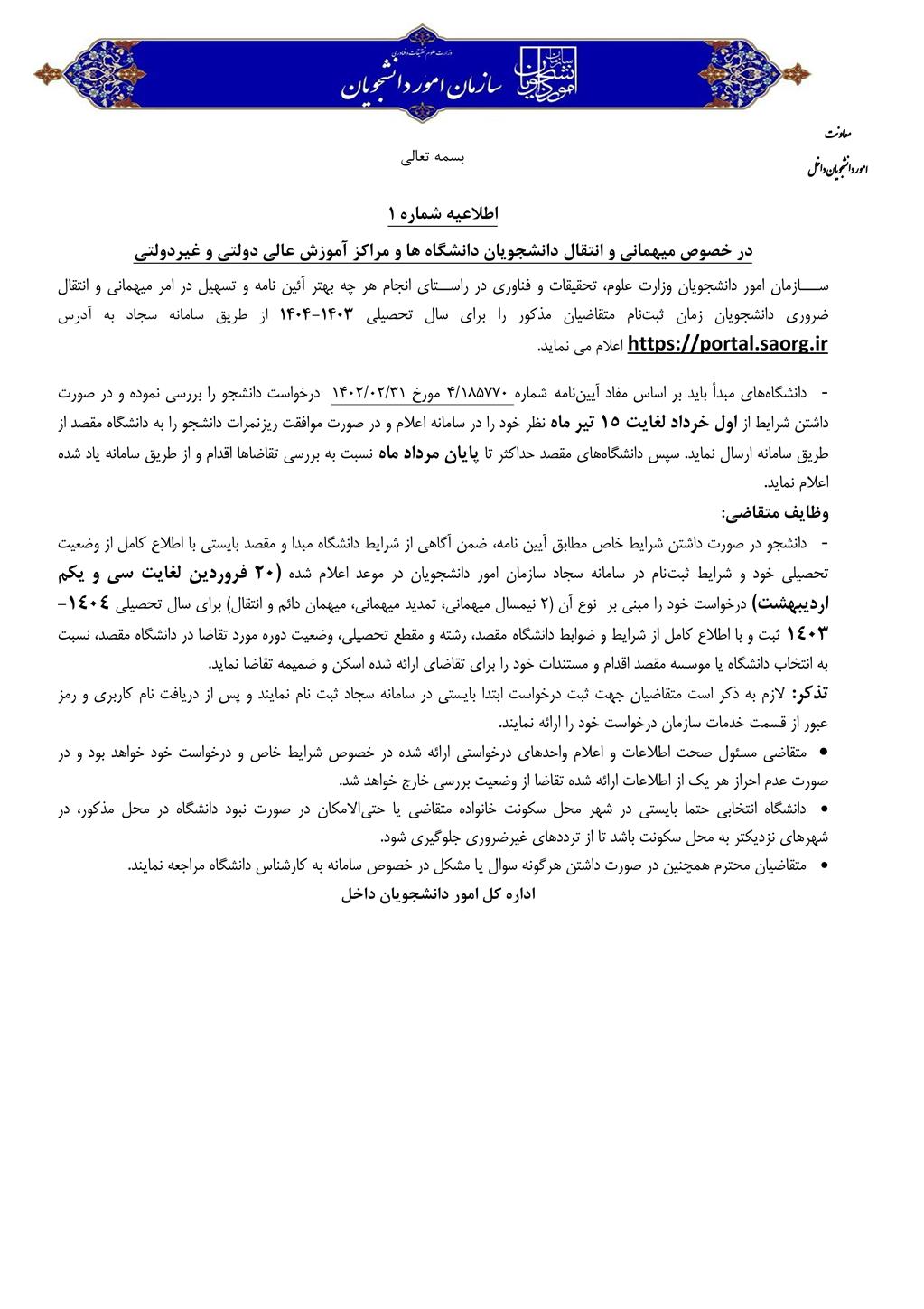 ابلاغ فعال شدن سامانه جهت درج درخواست میهمانی و انتقال دانشجویان ویژه دانشجویان کارشناسی