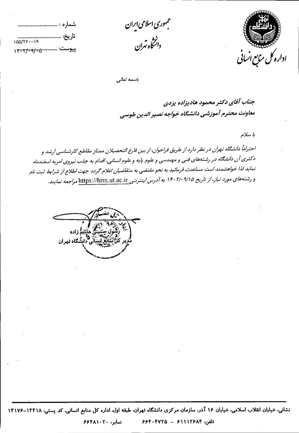 اطلاعیه جذب نیروی امریه دانشگاه تهران