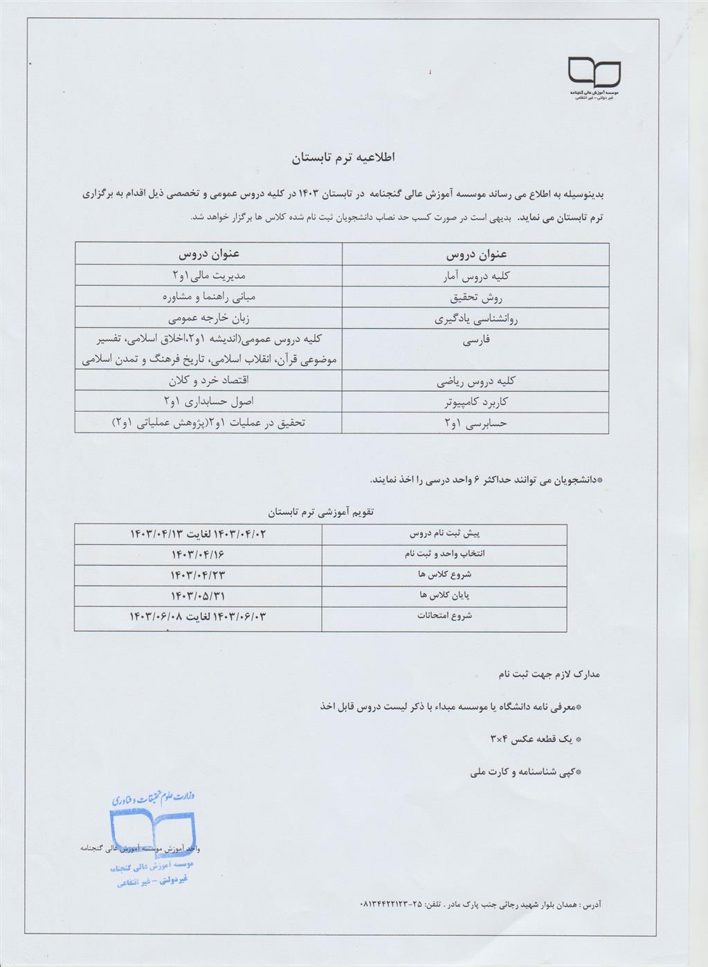 اطلاعیه در خصوص ترم تابستانی موسسه آموزش عالی گنجنامه همدان
