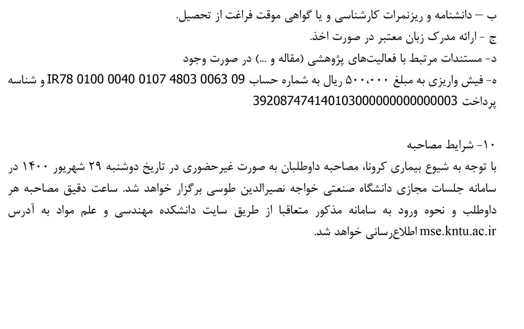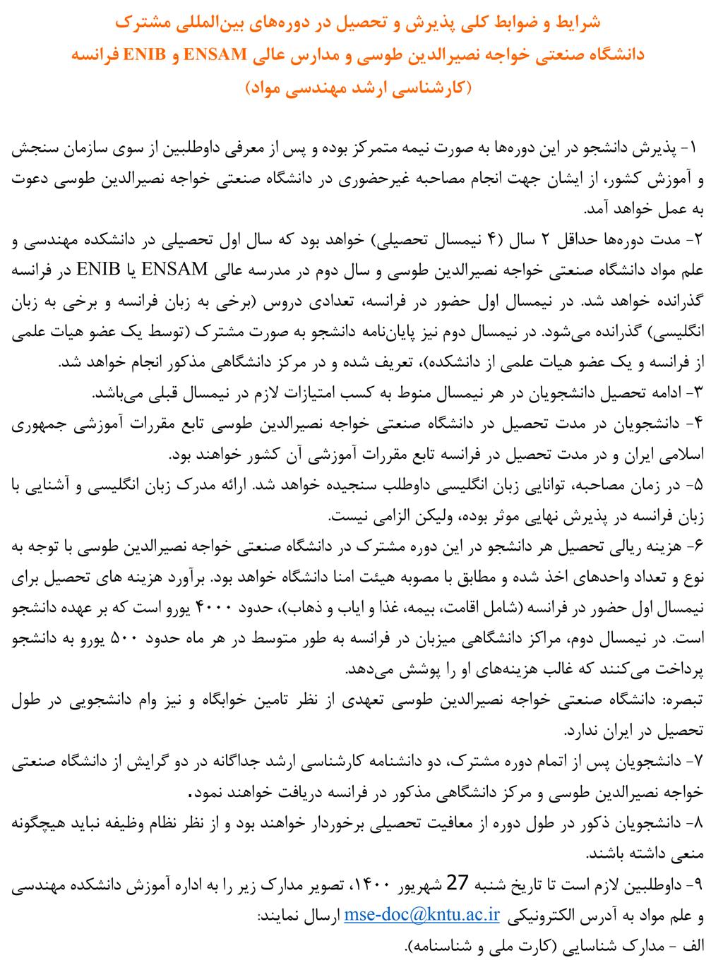 اطلاعیه شرایط دوره مشترک با فرانسه - دانشكده مهندسی مواد