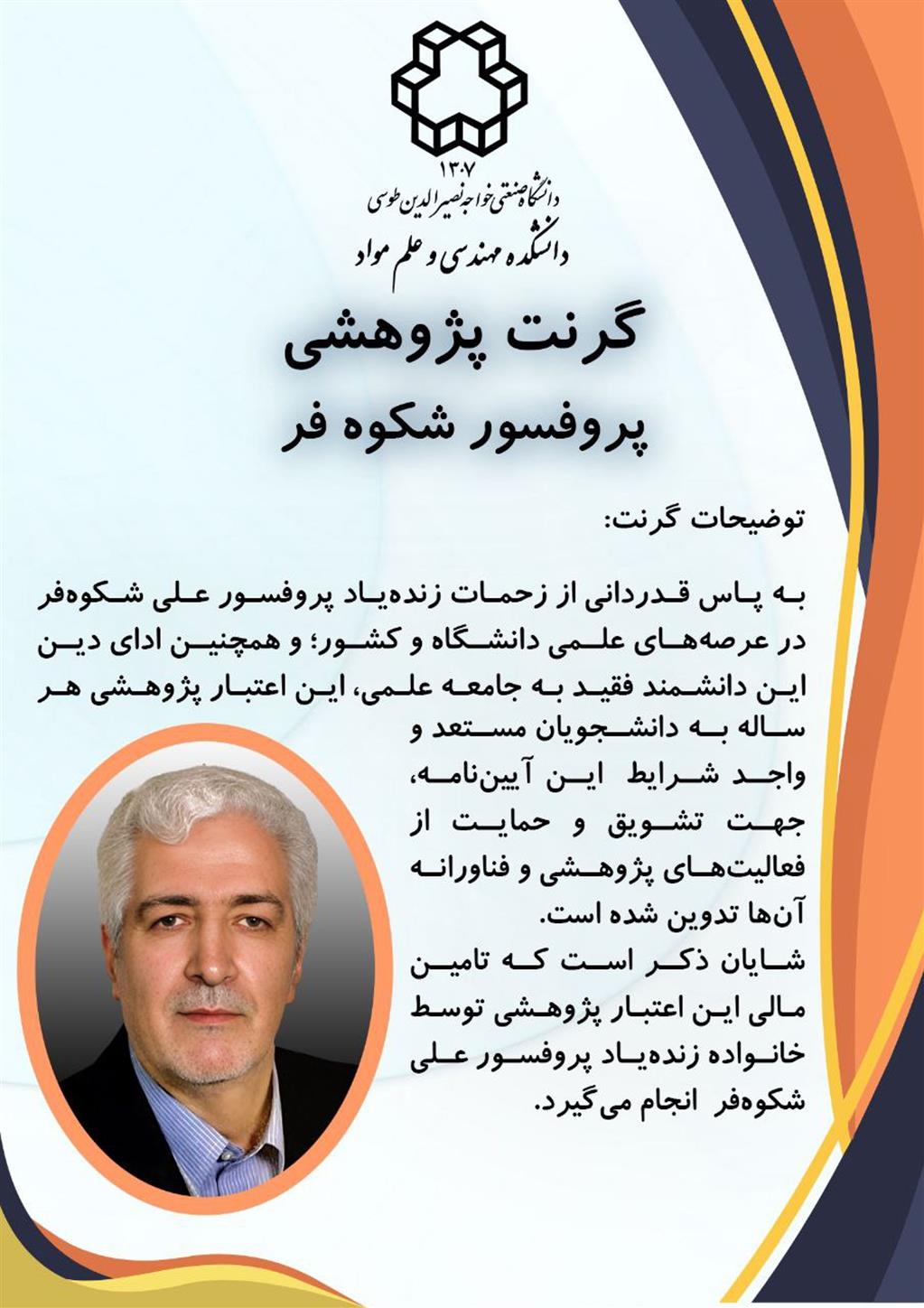به استحضار می رساند به پاس قدردانی از زحمات زنده یاد پروفسور شکوه فر در عرصه های علمی دانشگاه و کشور هرساله به دانشجویان مستعد و واجد شرایط گرنت پژوهشی اعطا می‌گردد.  لازم به ذکر است تقاضانامه انتخاب دانشجویان دریافت کننده گرنت پژوهشی از لینک زیر قابل دریافت است.