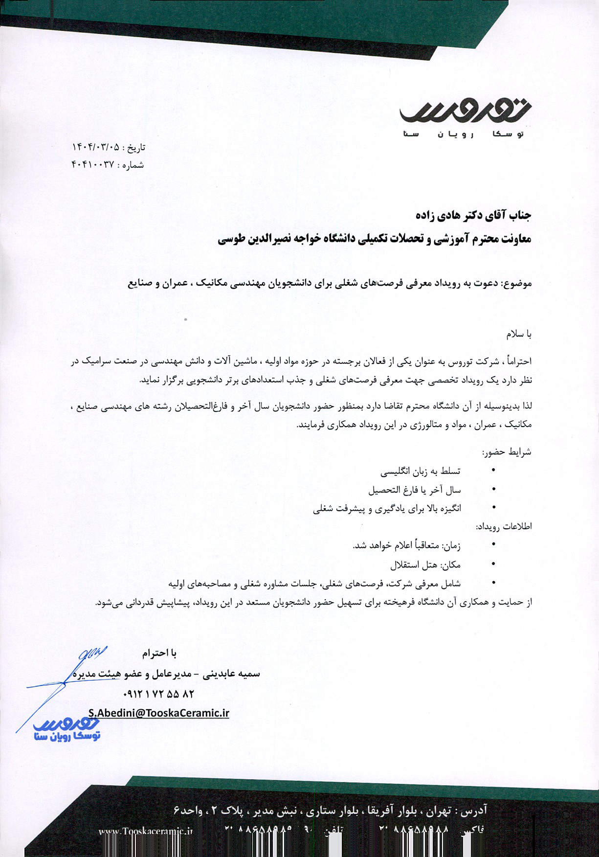 اطلاع رسانی دعوت به رویداد معرفی فرصت های شغلی برای دانشجویان سال آخر و فارغ التحصیلان رشته مهندسی و علم مواد