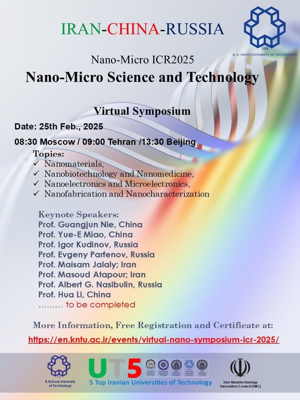 به گزارش روابط عمومی دانشگاه؛ سمپوزیوم علمی"نانو-میکرو ICR۲۰۲۵"با همکاری ستاد ویژه توسعه فناوری‌نانو (INIC) و دانشگاه صنعتی خواجه نصیرالدین طوسی و مشارکت دانشگاه‌های برتر صنعتی کشور (UT۵)با هدف بررسی پیشرفت‌های نوین در حوزه‌ میکروالکترونیک و امکان تبادل دانش و تجربیات علمی بین محققان، اساتید دانشگاه و متخصصان صنعتی از سه کشور ایران، چین و روسیه برگزار شد. در این رویداد، مباحث وسیعی در زمینه‌های مختلف نانوفناوری که شامل نانومواد و کاربردهای آن‌ها، نانوزیست‌فناوری و نانوداروها، نانوالکترونیک و میکروالکترونیک و تولید و مشخصه‌یابی نانوساختارها توسط شخصیت‌های علمی از دانشگاه‌ها و موسسات تحقیقاتی برتر جهان مورد بحث و بررسی قرار گرفت از جمله: