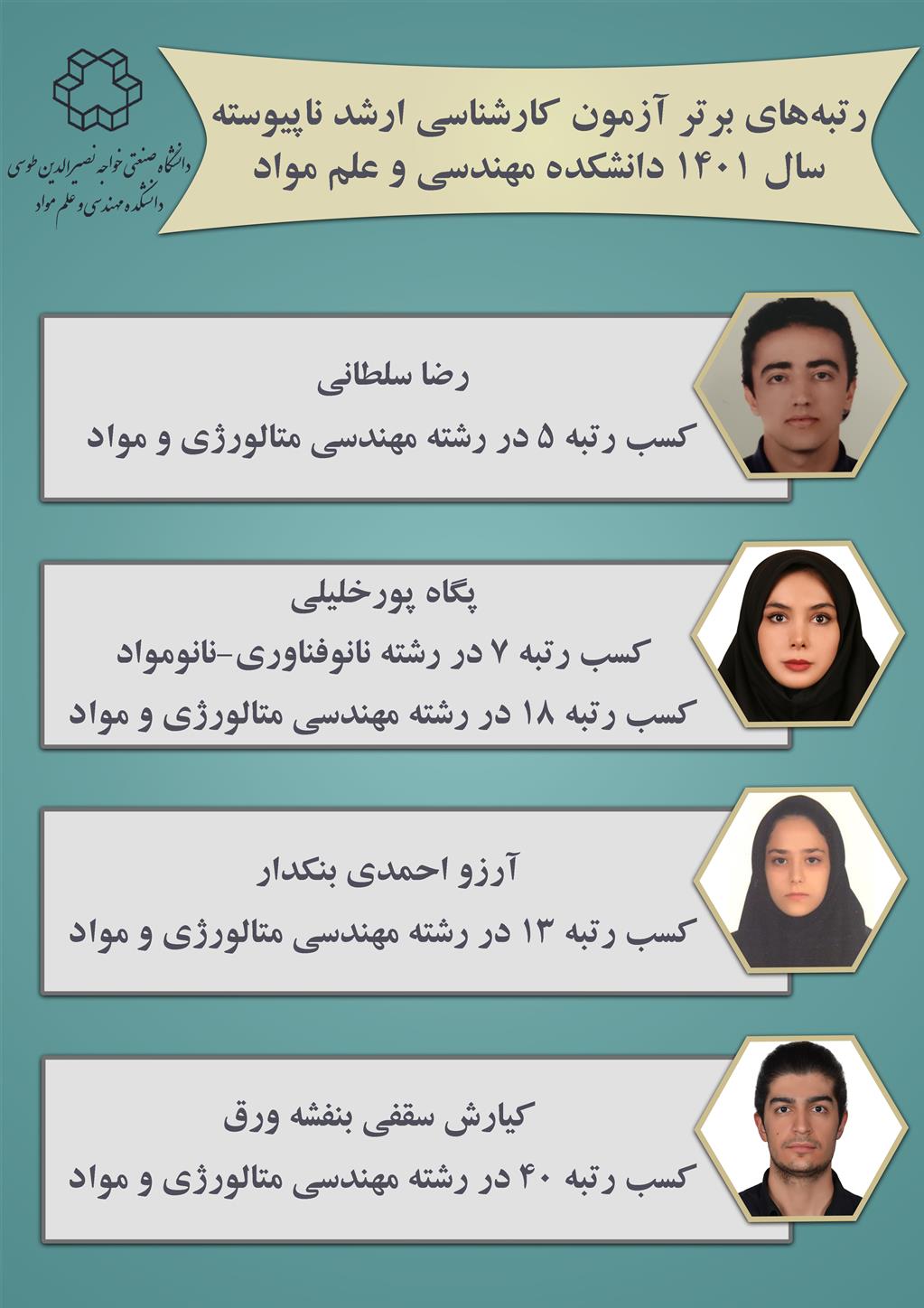 رتبههای برتر آزمون کارشناسی ارشد ناپیوسته سال 1401 دانشکده مهندسی و علم مواد - دانشكده مهندسی مواد