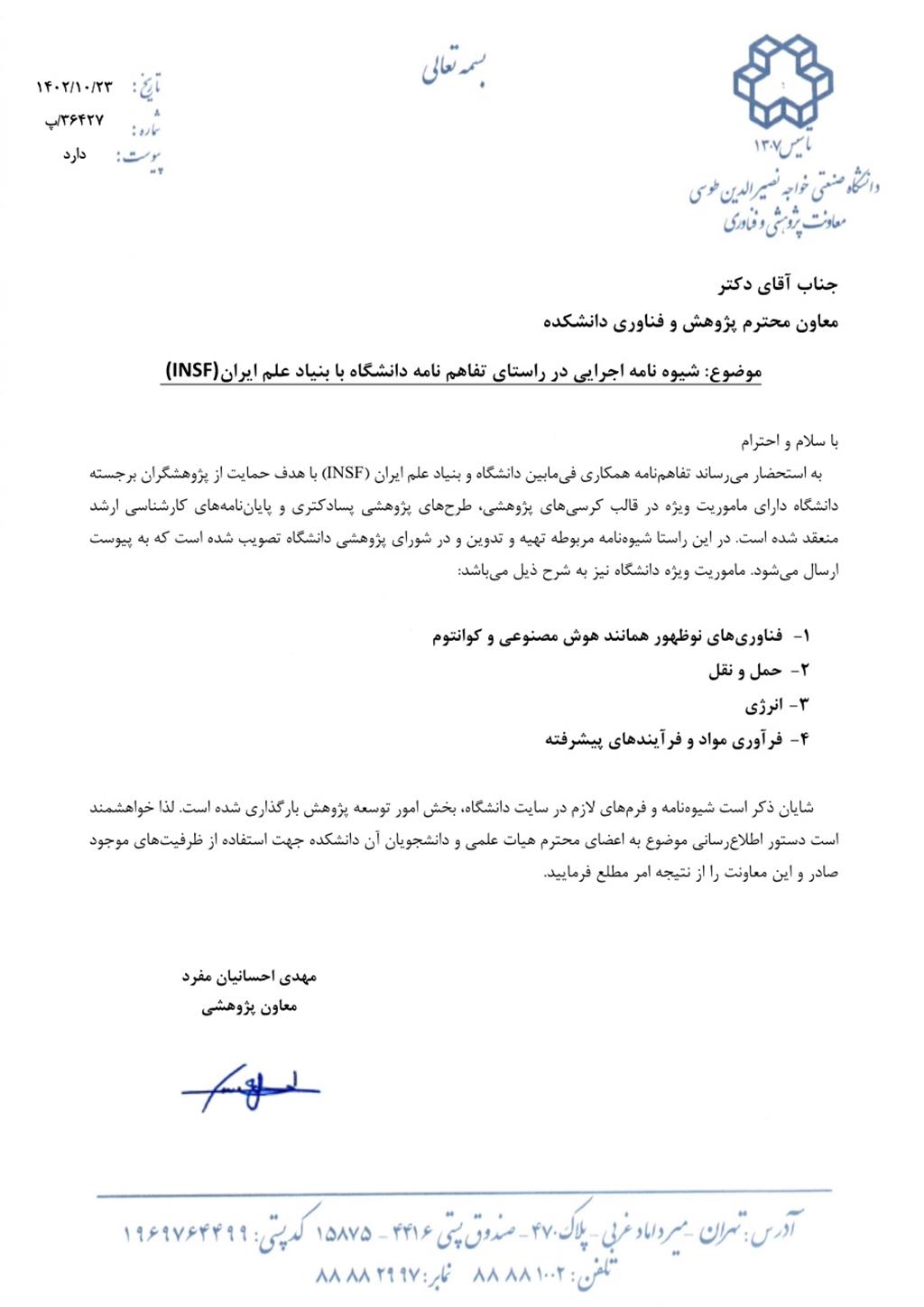 شیوه نامه اجرایی در راستای تفاهم نامه دانشگاه با بنیاد علم ایران