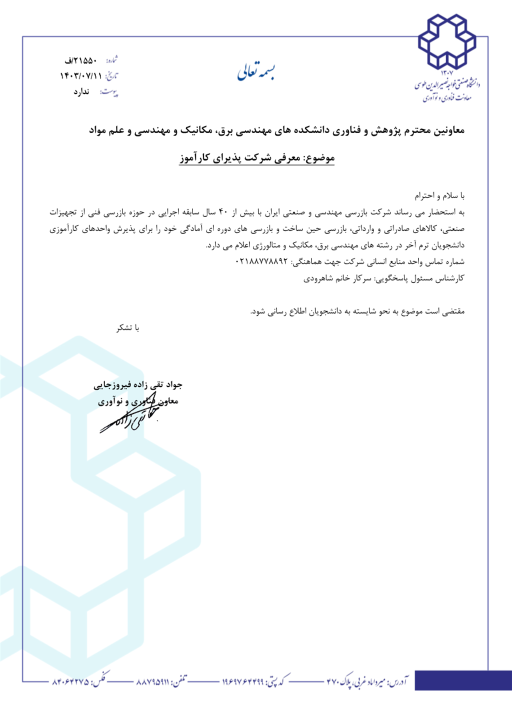 فراخوان دوره کارآموزی در شرکت بازرسی مهندسی و صنعتی ایران - دانشكده مهندسی مواد