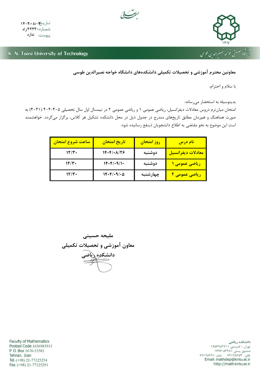 اعلام برنامه امتحانی میان ترم هماهنگ نیمسال 4041 دروس معادلات دیفرانسیل، ریاضی عمومی 1 و ریاضی عمومی 2