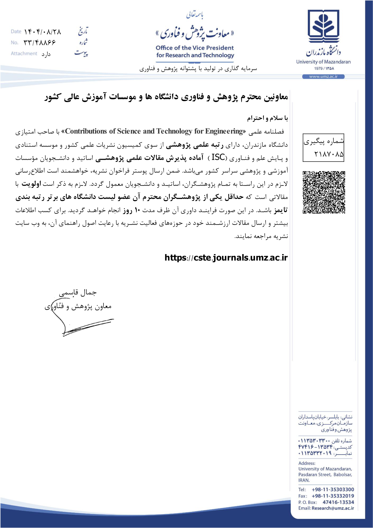 فراخوان پذیرش مقاله نشریه Contributions of Science and Technology for Engineering/به صاحب امتیازی دانشگاه مازندران