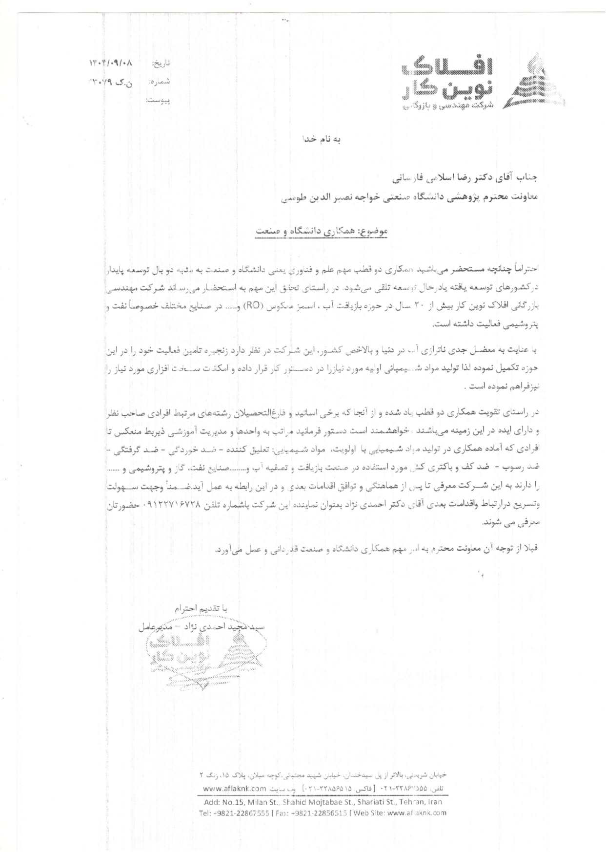اطلاع رسانی همکاری دانشگاه با شرکت مهندسی و بازرگانی افلاک نوین کار