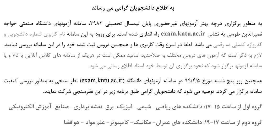 اطلاعیه آزمون های غیر حضوری پایان نیمسال 3982