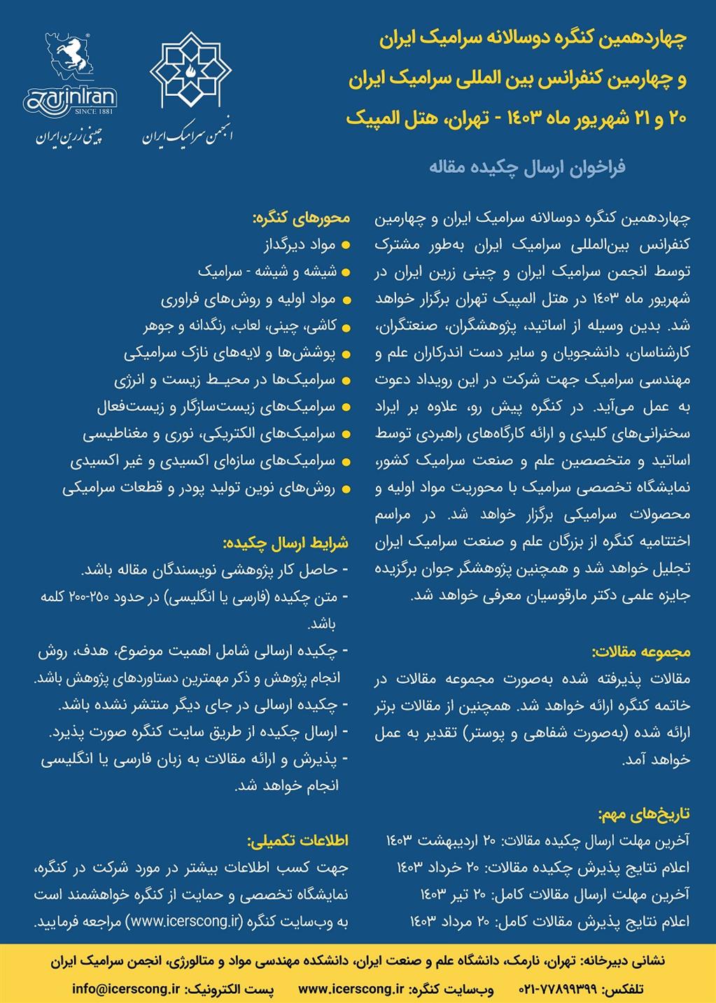 اطلاعیه برگزاری چهاردهمین کنگره دوسالانه سرامیک ایران و چهارمین کنفرانس بین المللی سرامیک ایران