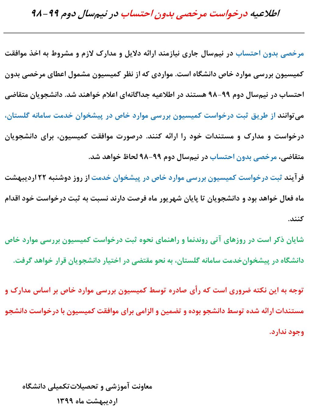 اطلاعیه درخواست مرخصی بدون احتساب در نیم سال 99-98