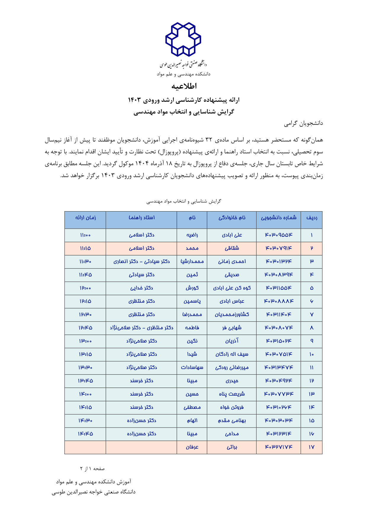 اطلاعیه زمان بندی دفاع از پروپوزال مقطع کارشناسی ارشد ورودی ۱۴۰۳ گرایش شناسایی و انتخاب مواد مهندسی