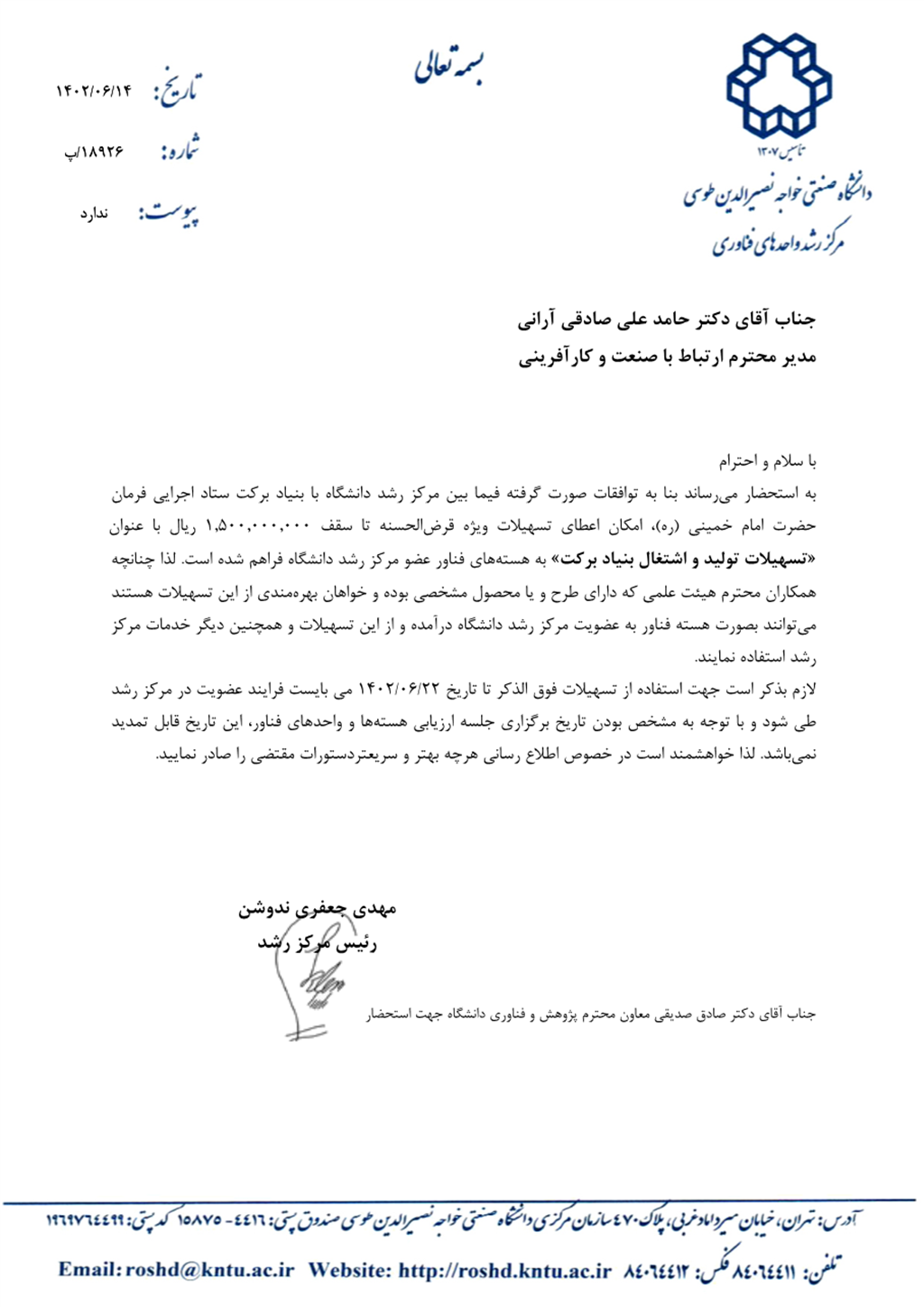 اطلاعیه عضویت در مرکز رشد و استفاده از خدمات آن