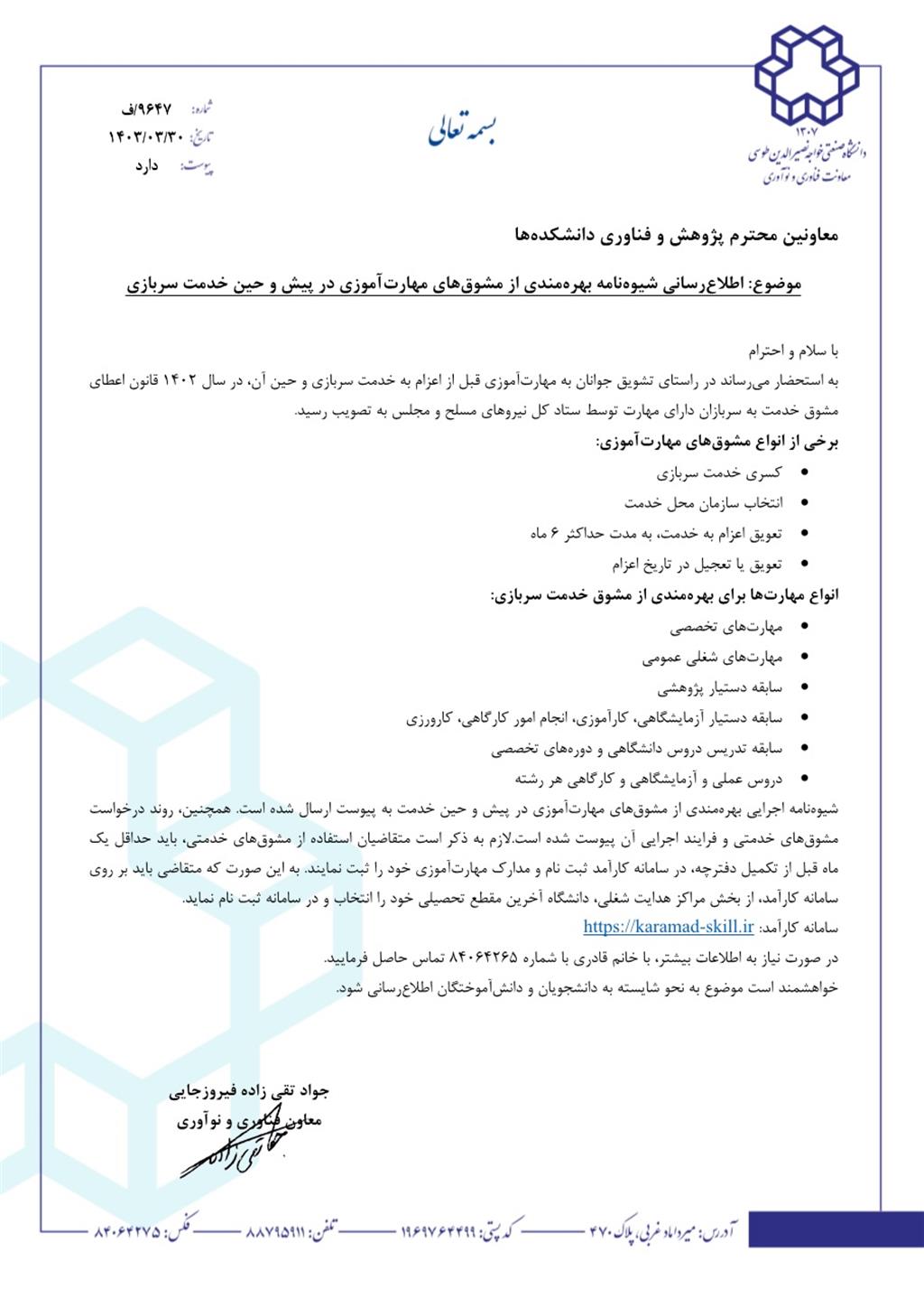 اطلاع رسانی شیوه نامه بهره مندی از مشوق های مهارت آموزی در پیش و حین خدمت سربازی - دانشكده مهندسی مواد