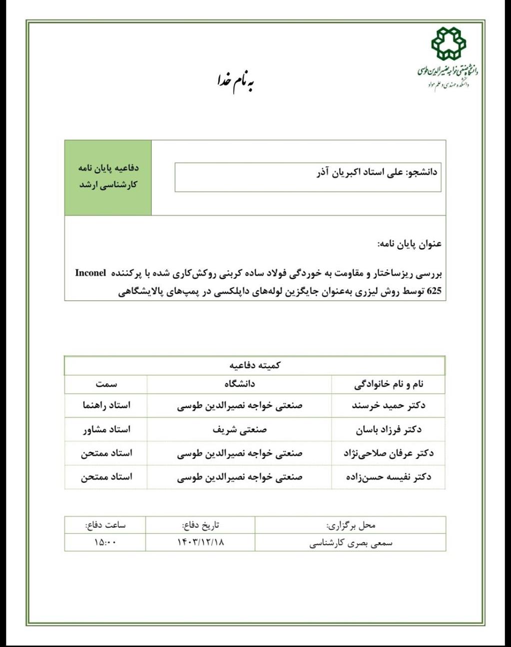 دانشجو: علی استاداکبریان آذر - استاد راهنما: دکتر حمید خرسند - دانشكده مهندسی مواد