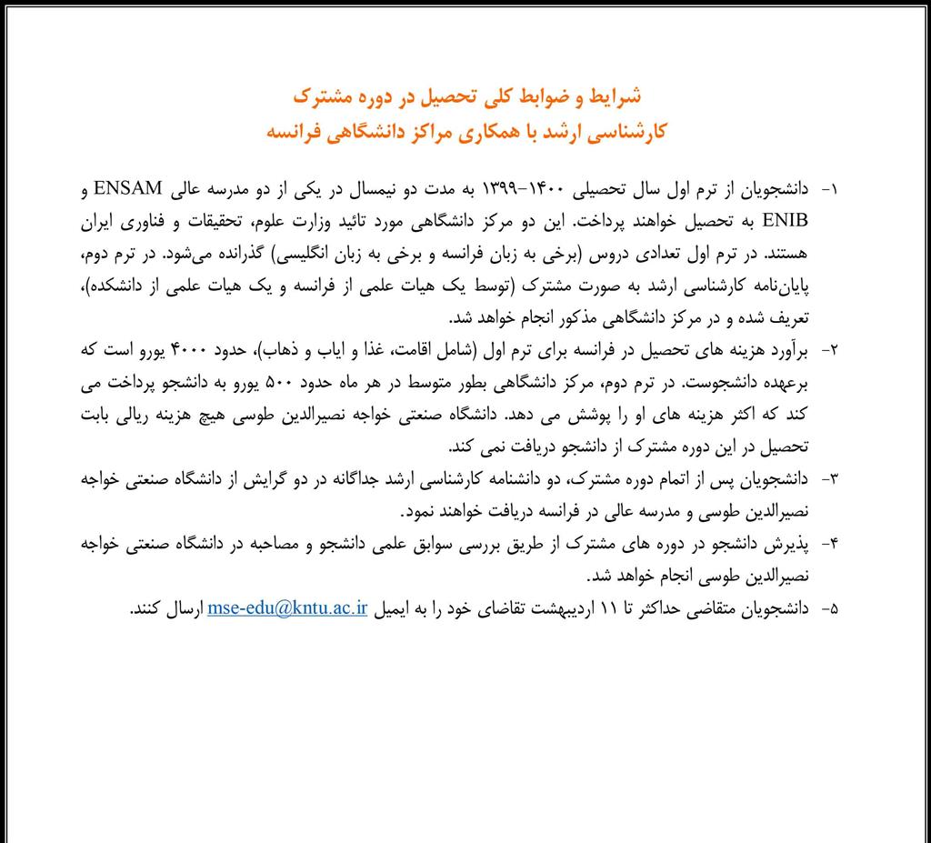 شرایط و ضوابط کلی تحصیل در دوره مشترک کارشناسی ارشد با همکاری مراکز دانشگاهی فرانسه