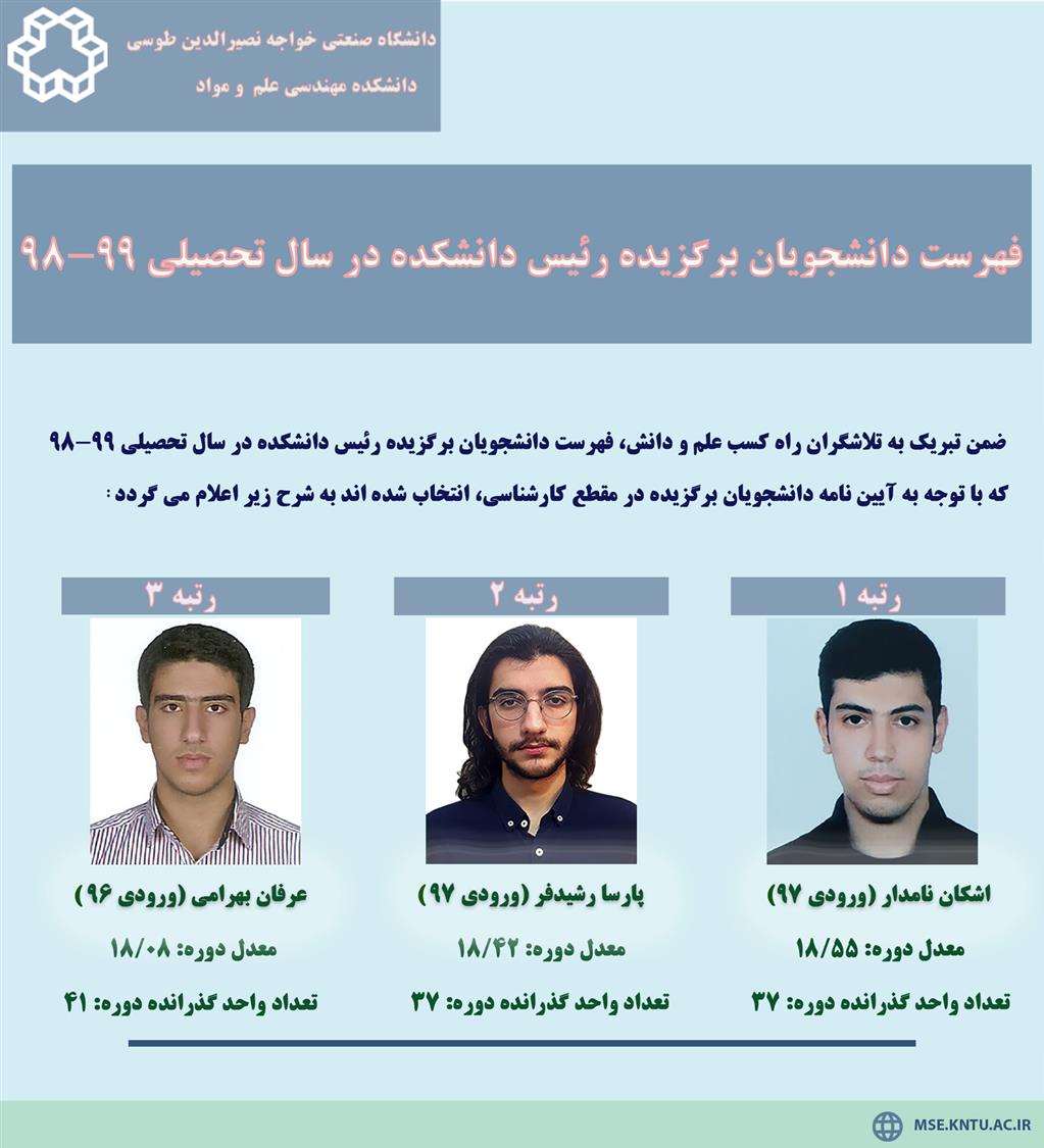 فهرست دانشجویان برگزیده رئیس دانشکده در سال تحصیلی 99-98 در مقطع کارشناسی - دانشكده مهندسی مواد