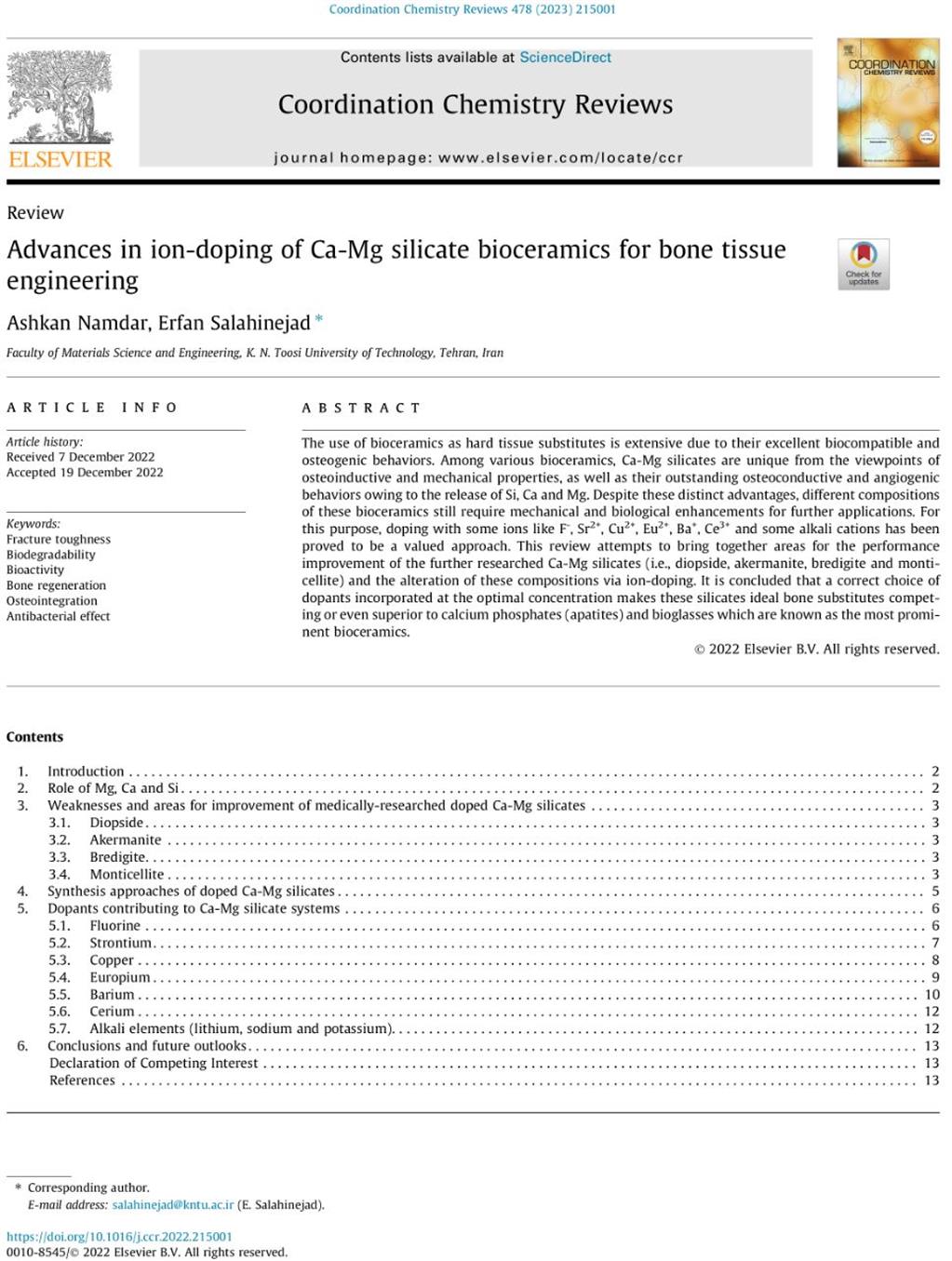 چاپ مقاله مروری توسط آقای اشکان نامدار و آقای دکتر عرفان صلاحی نژاد در مجله معتبر Coordination Chemistry Reviews با ضریب تاثیر 24.833 - دانشكده مهندسی مواد