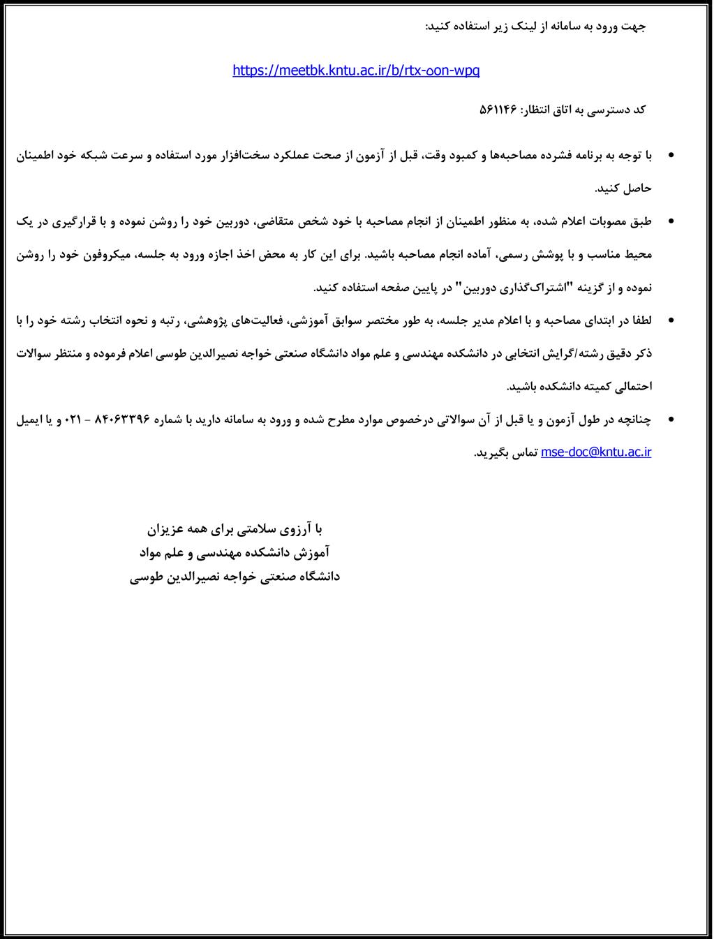 اطلاعیه مربوط به مصاحبه غیر حضوری دکتر مواد 1400 - دانشكده مهندسی مواد
