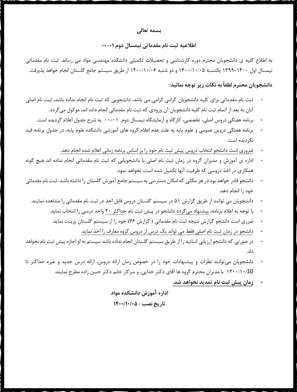 اطلاعیه پیش ثبت نام نیمسال دوم سال تحصیلی 1401 - دانشكده مهندسی مواد