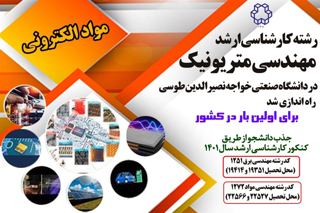 به گزارش روابط عمومی دانشگاه؛ گرایش کارشناسی ارشد مهندسی متریونیک (مواد الکترونی) برای اولین‌بار در کشور توسط دانشگاه صنعتی خواجه نصیرالدین طوسی ارائه شده است که دروس و پژوهش به طور مشترک توسط دانشکده‌های مهندسی برق و مواد ارائه شده است.